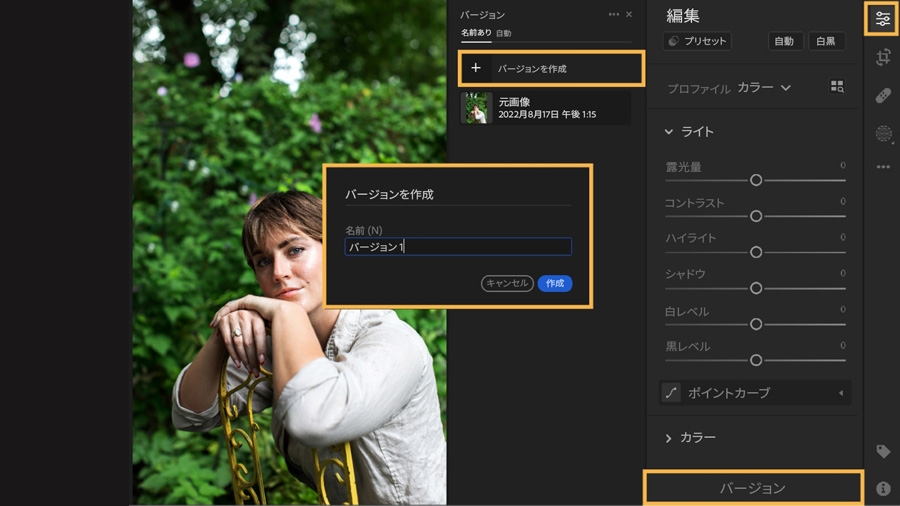 バージョン管理を使って、一連の編集結果を保存することができます。写真の調整が終わったら、編集パネルの下部にある「バージョン」をクリックします。「バージョンを作成」をクリックしてバージョンに名前を付けます。