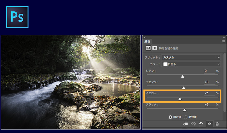 Photoshopで写真を読み込み、「特定色域の選択 」で特定のカラー範囲を調整。「白色系 」のイエローのスライダーをマイナス方向に動かし、光芒などのハイライトにも薄く色を乗せます。