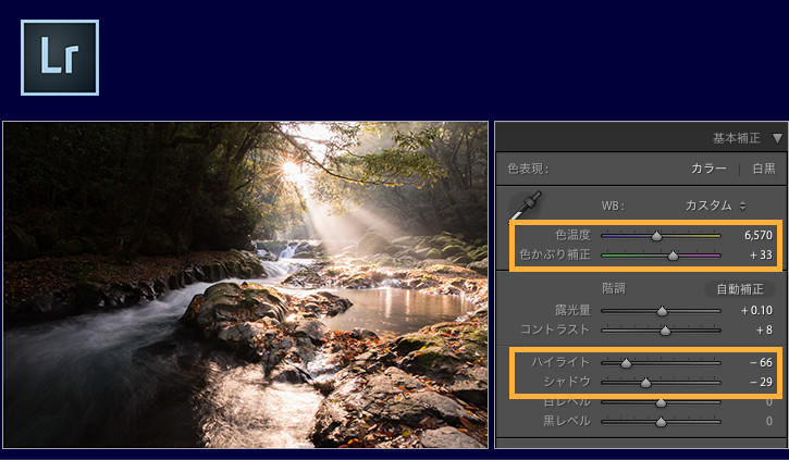 光が差し込んでいる写真右側を見ながら、基本補正パネル の「色温度 」を調整します。「色かぶり補正」で発色を整え、「ハイライト 」と「シャドウ 」の微調整で光芒、木々の葉、岩のメリハリを出します。