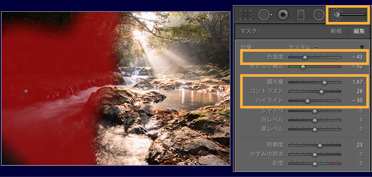 濡れている岩の表情を出すため「露光量 」「コントラスト 」「ハイライト 」の微調整を行います。川の流れは「色温度」を低くして青みを出し、「露光量 」「コントラスト 」で微調整します。