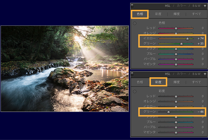 基本補正パネルの「ハイライト 」「コントラスト 」「色温度 」を再度微調整し、HSLパネルの「色相 」と「彩度 」でグリーンを強めます。