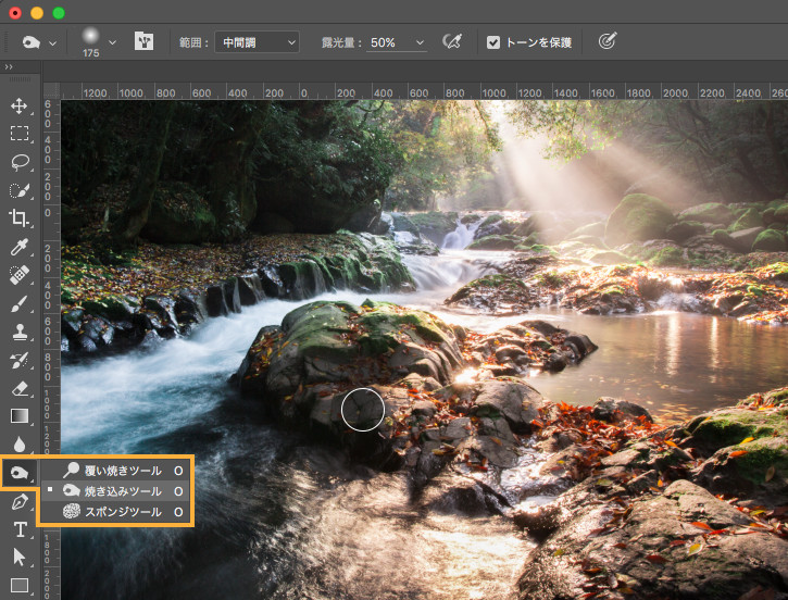 写真に立体感を作っていくために覆い焼きツール と焼き込みツール を使い、部分的な領域を明るく、または暗くしていきます。画面の一部分だけに光が当たっているような演出をすることで、撮影時の印象に近い立体感を作ります。