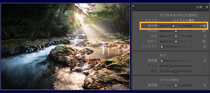 「周辺光量補正 」の「適用量 」のスライダーをマイナスに動かし、写真の四隅を暗くして雰囲気を作ります。