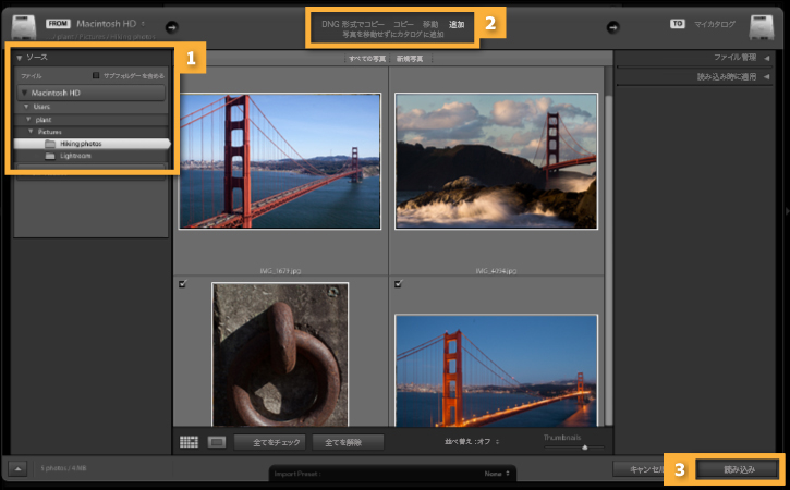 読み込みウィンドウの左にあるソースパネル で、読み込む写真を指定します。中央上部にある「追加 」を選択して、コンピューターまたはドライブから写真を読み込むか、「コピー 」を選択して、カメラのメモリーカードから写真を読み込みます。