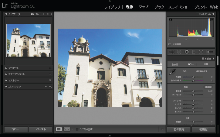画面上部にある「現像 」をクリックします。 サンプルの写真は低いアングルから撮影されており、建物が撮影者と反対側に傾いてゆがんでいるように見えます。この遠近感とゆがみを補正できます。
