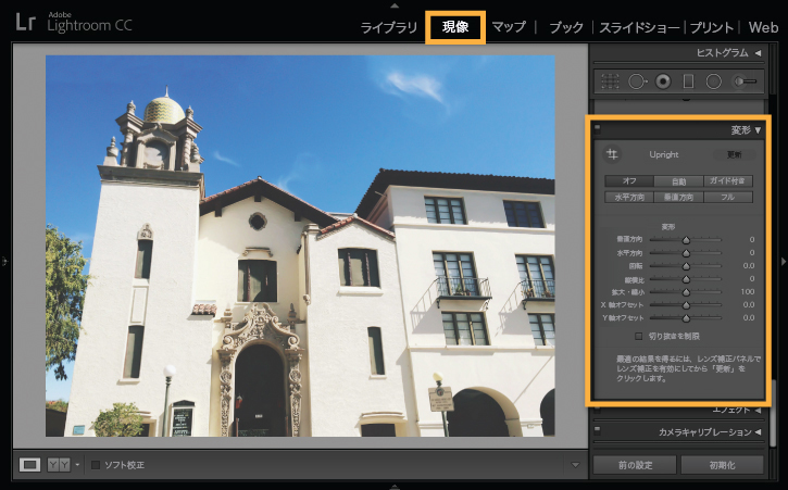 写真の遠近感の補正に使用できるUpright のオプション(変形 パネル内)を確認します。
