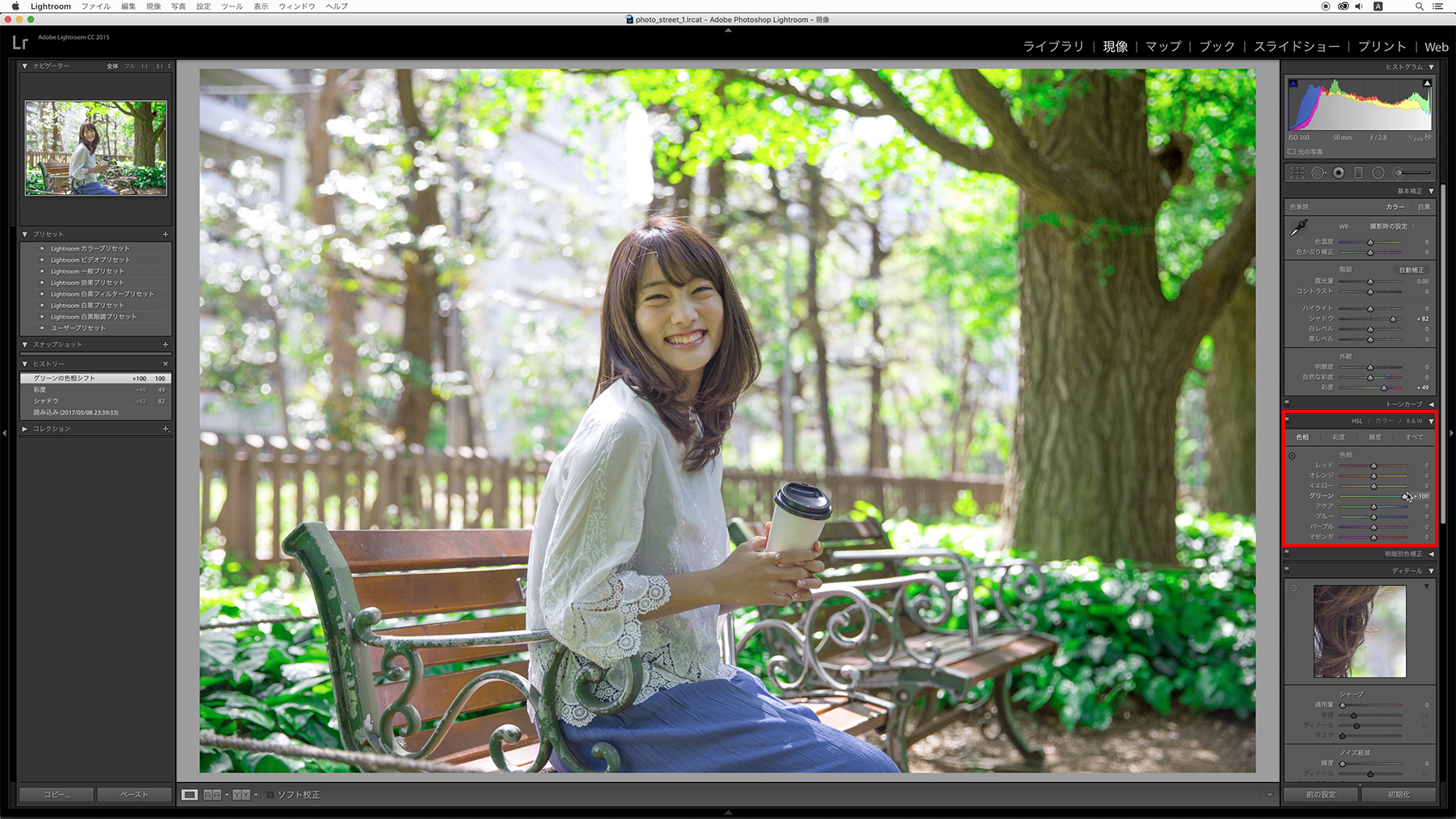 HSLパネルの[色相]→[グリーン]のスライダーを右にドラッグして緑の色味を調整します。
