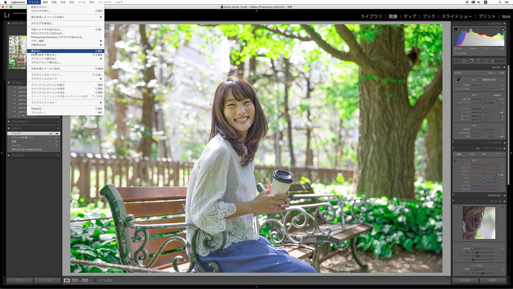 仕上げた写真を他の人と共有したい場合などは書き出しを行います。[ファイル]メニュー → [書き出し]をクリックして書き出しメニューを表示します。