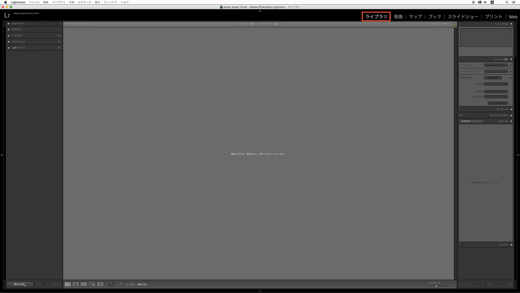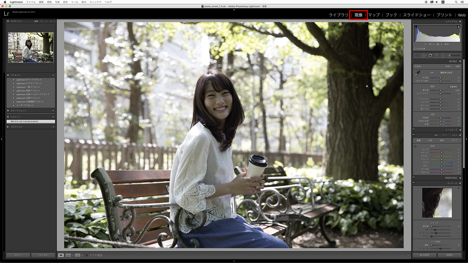 写真が読み込み終わったら編集したい写真をクリックして選択し、[現像]タブをクリックするか、ショートカットの[D]を押します。現像のモジュールに切り替わり、いよいよ画像編集に入ります。
