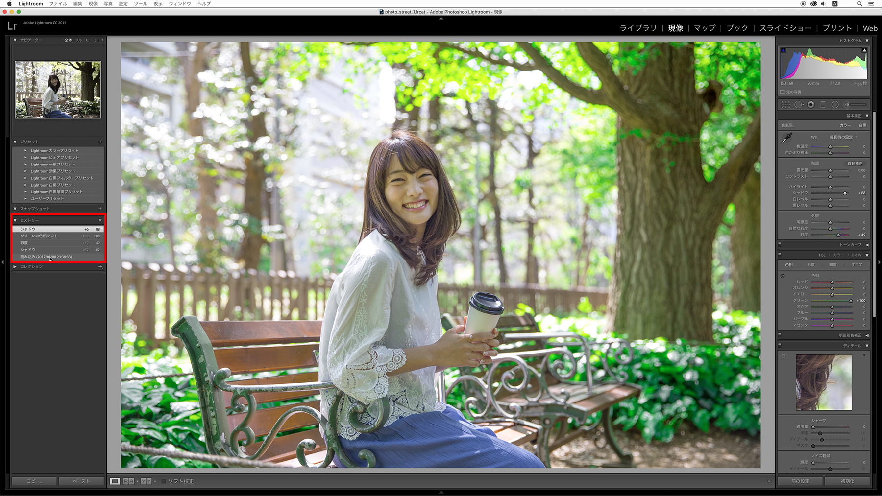 左側にあるヒストリーパネルでは、編集内容を確認したり、編集を元に戻すこともできます。