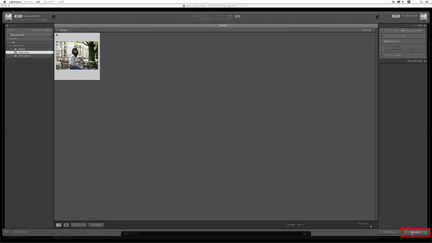左のパネルから編集したい写真を選択し(編集する写真をドラッグアンドドロップすることもできます)、右側にあるオプションのファイル管理から「重複を読み込まない」にチェックをいれます。(ファイル管理が表示されていない場合は、[ファイル管理 ◀︎]をクリックして開きます)