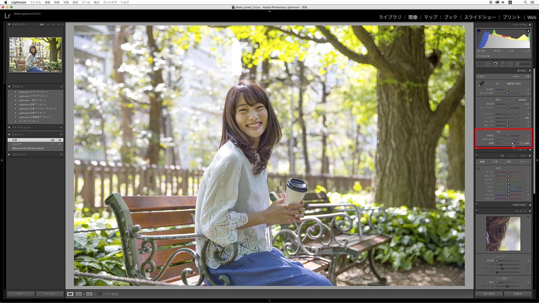 右側にある基本補正パネルの[色表現]→[外観]→[彩度]のスライダーを右にドラッグして調整します。