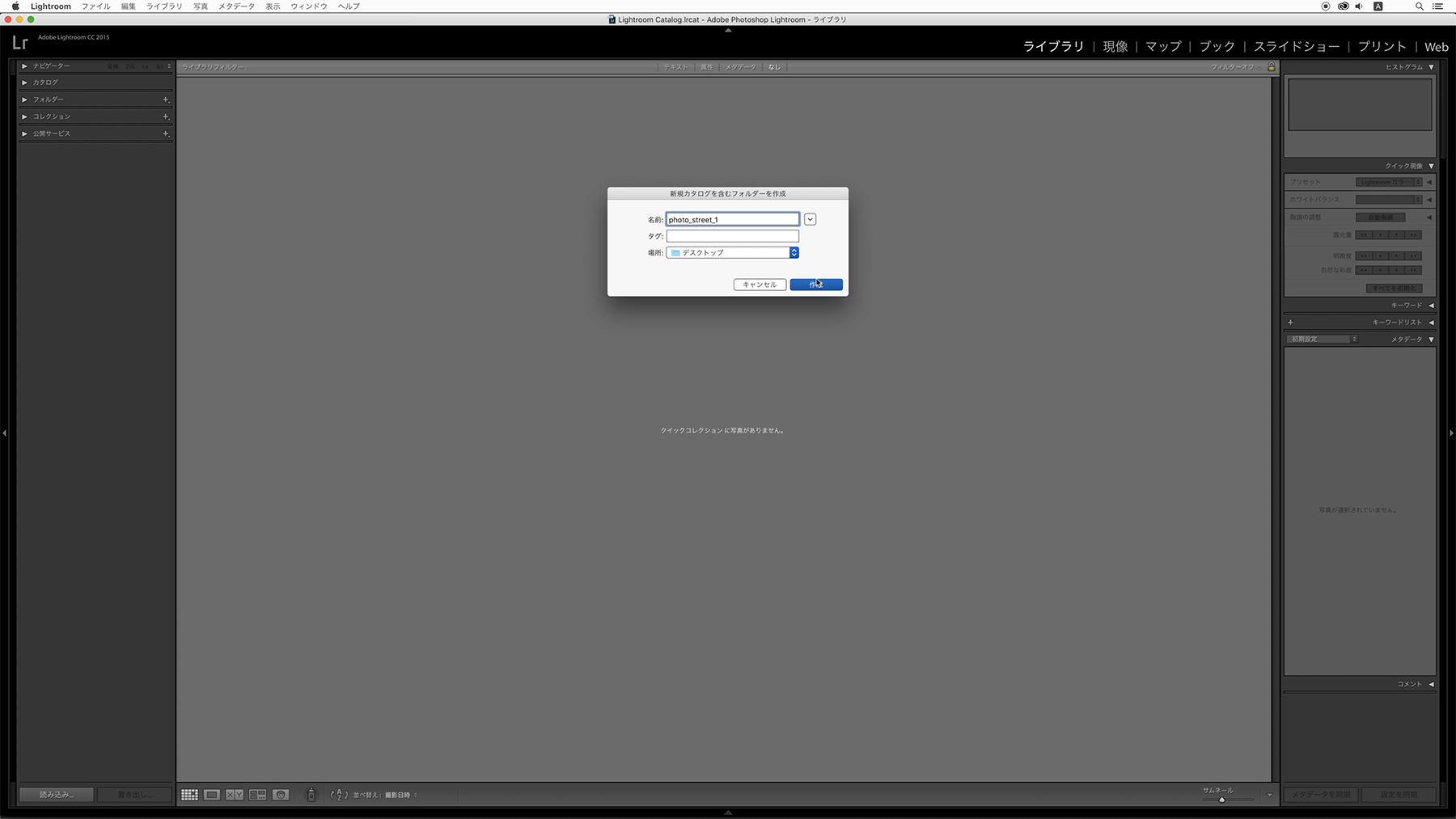 アプリケーションメニューの[ファイル] → [新規カタログ]をクリックします。「新規カタログを含むフォルダーを作成」ダイアログボックスが表示されるので、好きな名前をつけて[作成]ボタンをクリックします。フォルダーが作成され、Lightroomが再起動して、作成したカタログを開きます。テーマごとにカタログを作ると管理がしやすくなります。