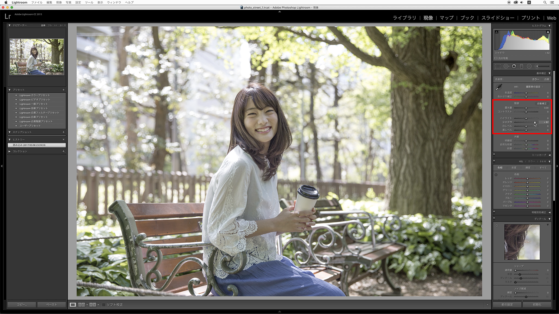 右側にある基本補正パネルの[色表現]→[階調]→[シャドウ]のスライダーを右にドラッグして調整します。明るいところはそのままで、暗いところだけを明るくすることができます。
