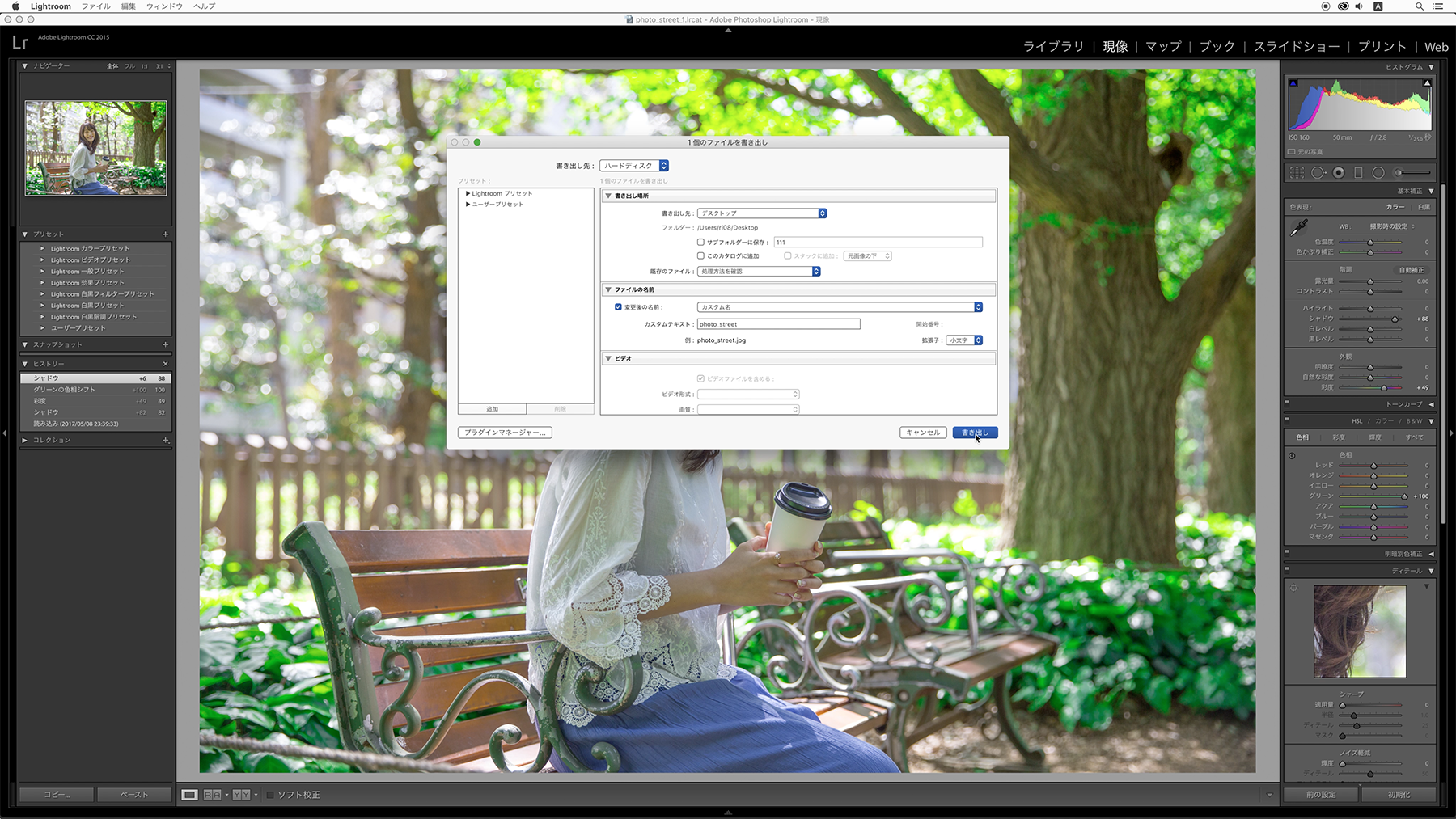 書き出し先の[元の写真と同じフォルダー]を選び、その下の「サブフォルダーに保存」にチェックを入れると、選んだフォルダーの中に好きな名前のフォルダーが作られ、そこに写真が保存されますので、好きな名前を入力し[書き出し]をクリックします。これで色調補正が完了しました。サブフォルダーに写真が保存されているか確認してみましょう。
