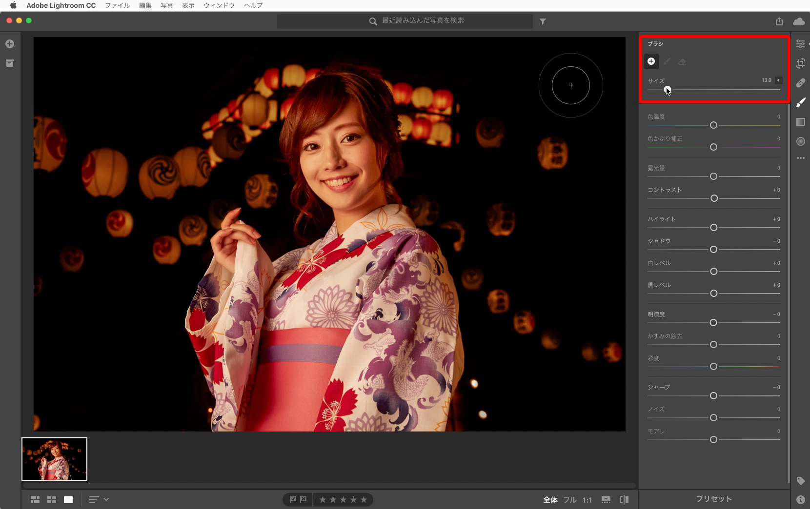 明るい部分はそのままに、暗い部分を明るくしたいので、右パネルの[ブラシ]→[サイズ]のスライダーでブラシの大きさを調整します。