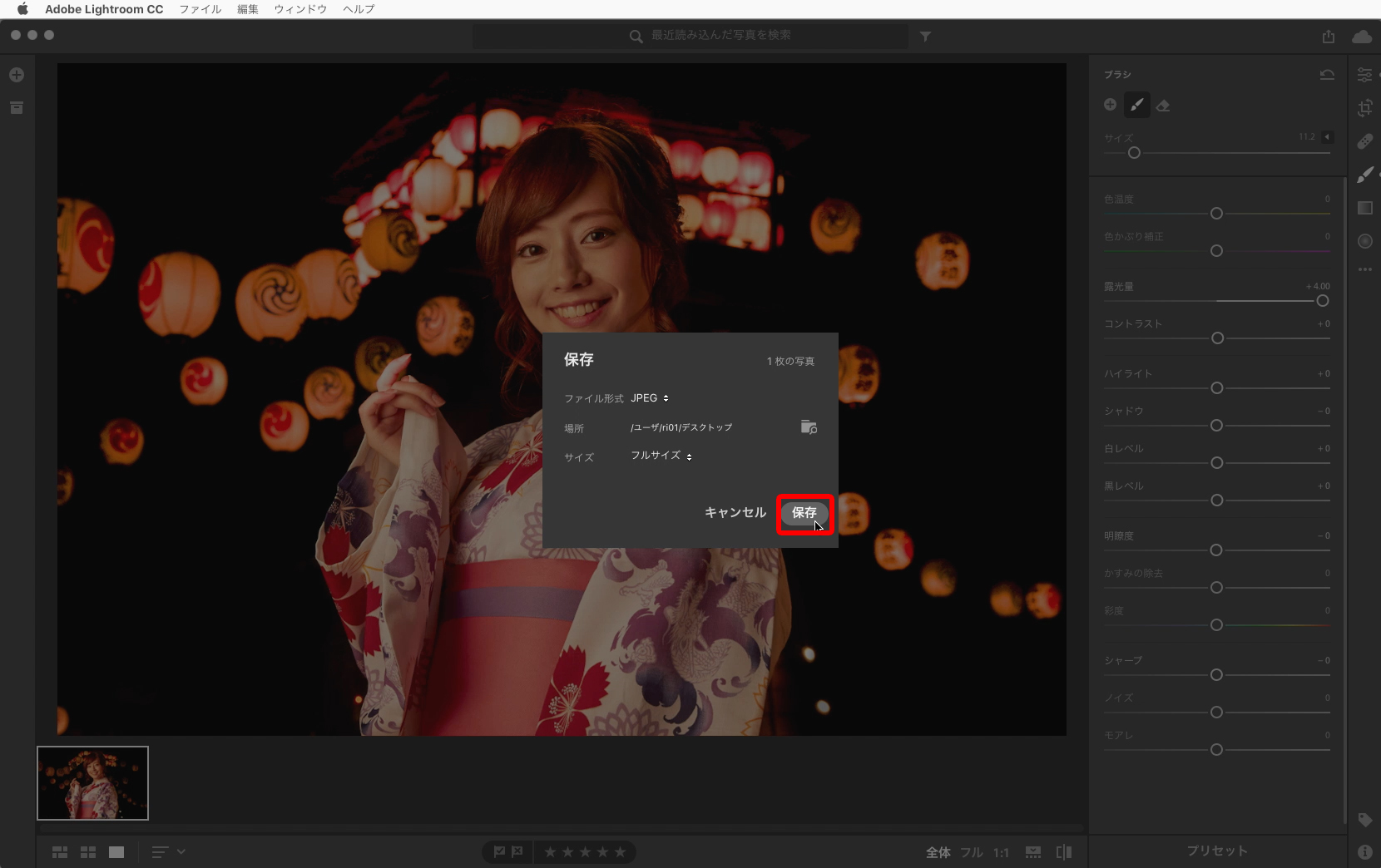 [ブラシ]→[+]で新しいブラシを開始を選択し、写真の明るくしたい提灯部分をドラッグしてブラシでなぞっていきます。