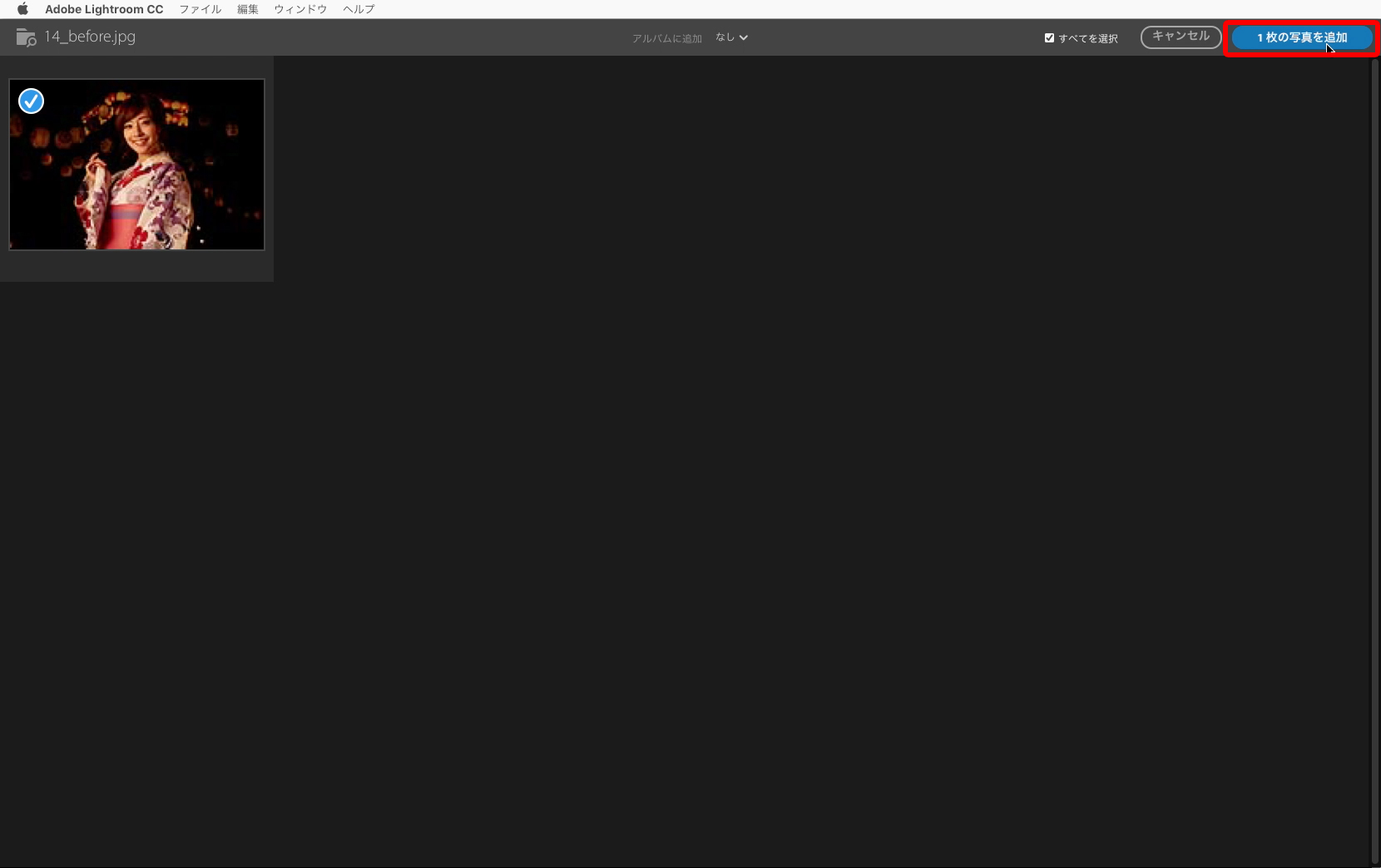 編集したい写真が選択できたら、右上にある[1枚の写真を追加]ボタンをクリックします。