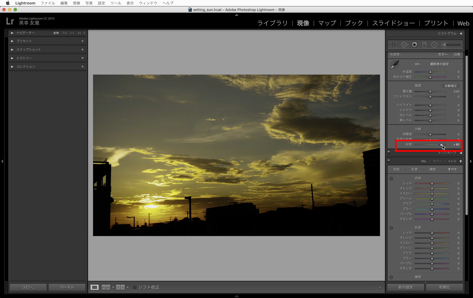 右側にある基本補正パネルの[色表現]→[外観]→[彩度]のスライダーを右にドラッグして調整します。
