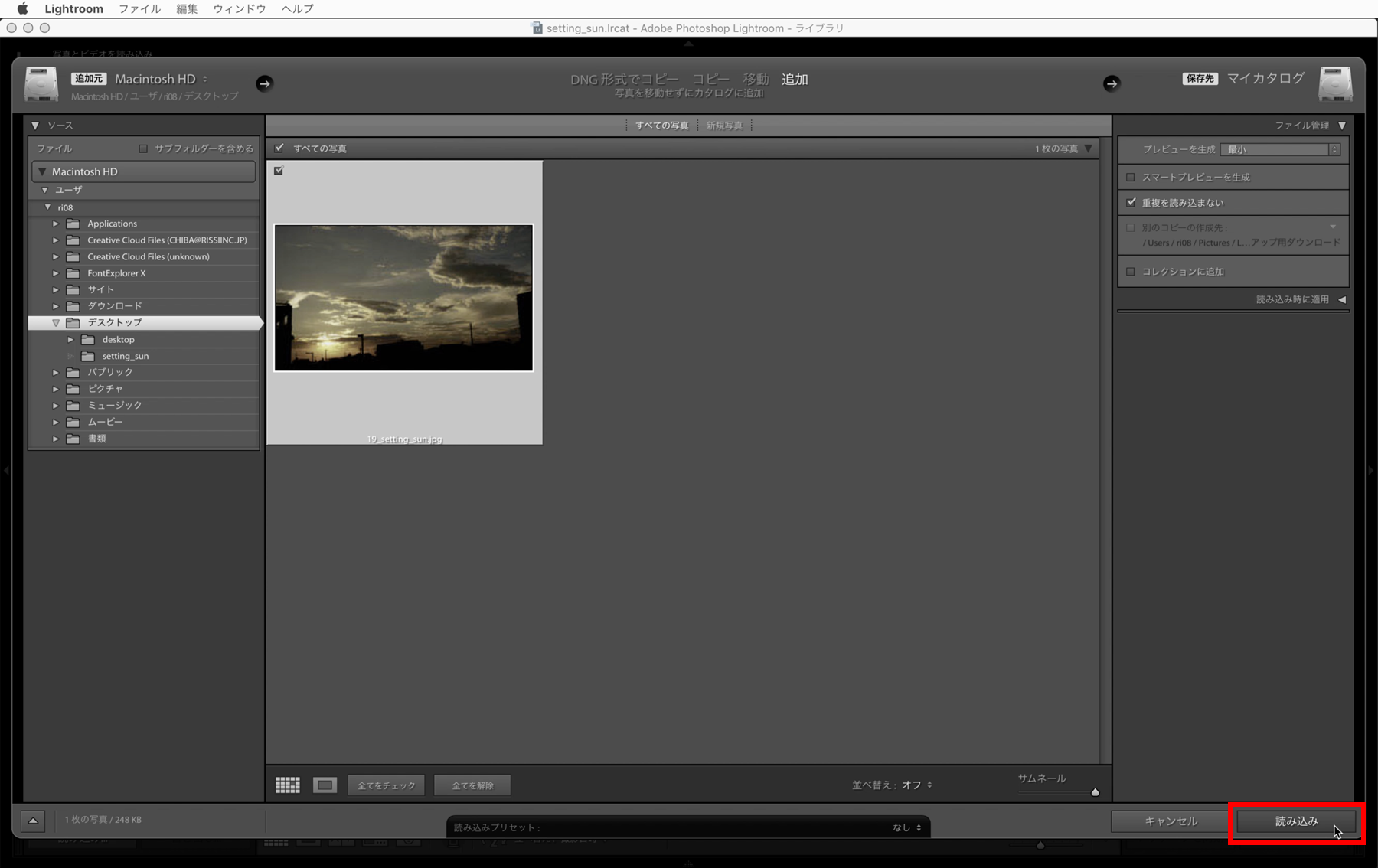 左のパネルから編集したい写真を選択し(編集する写真をドラッグアンドドロップすることもできます)、右側にあるオプションのファイル管理から「重複を読み込まない」にチェックをいれます。(ファイル管理が表示されていない場合は、[ファイル管理 ◀︎]をクリックして開きます)