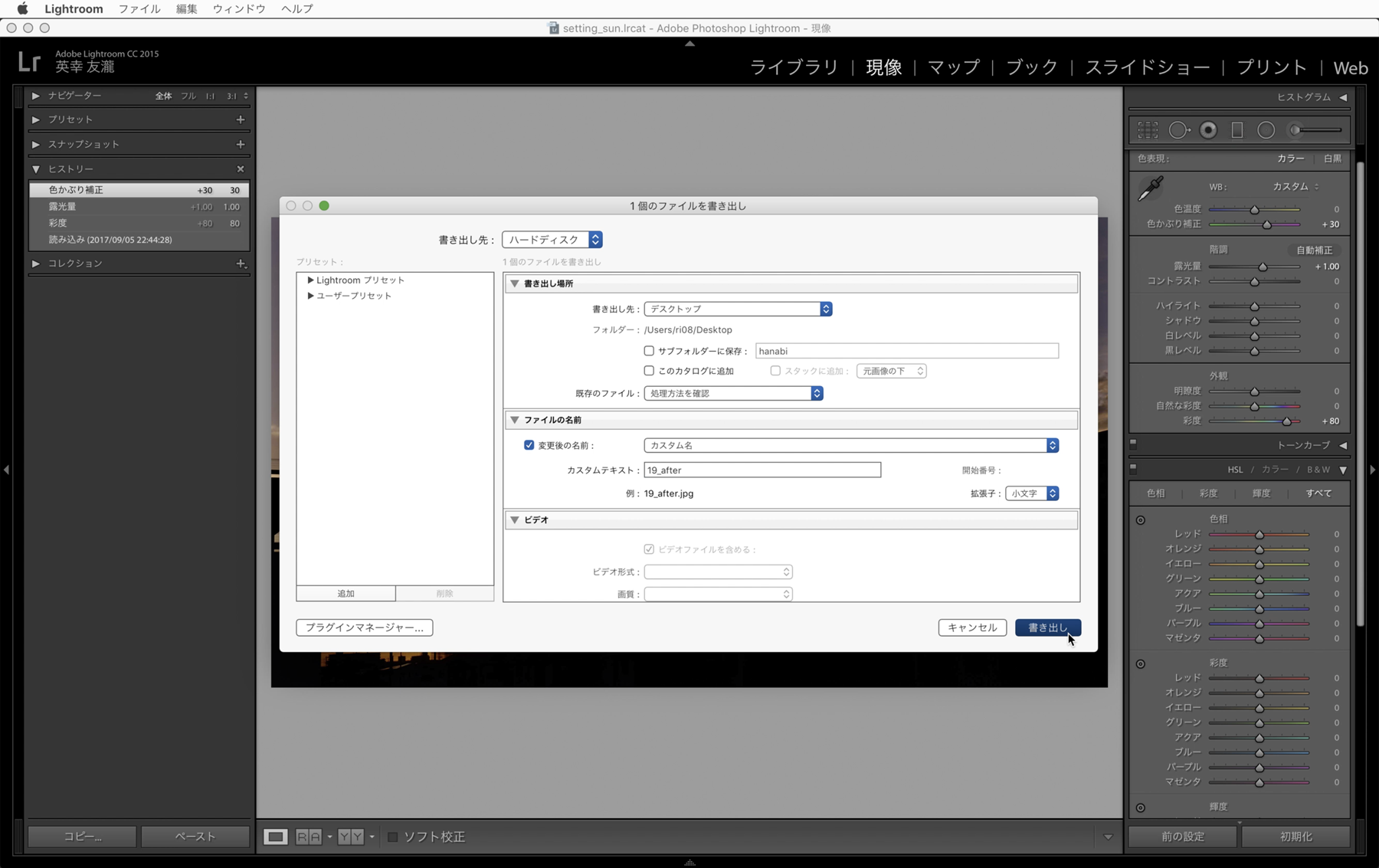 書き出し先の[元の写真と同じフォルダー]を選び、その下の「サブフォルダーに保存」にチェックを入れると、選んだフォルダーの中に好きな名前のフォルダーが作られ、そこに写真が保存されますので、好きな名前を入力し[書き出し]をクリックします。これで色調補正が完了しました。サブフォルダーに写真が保存されているか確認してみましょう。