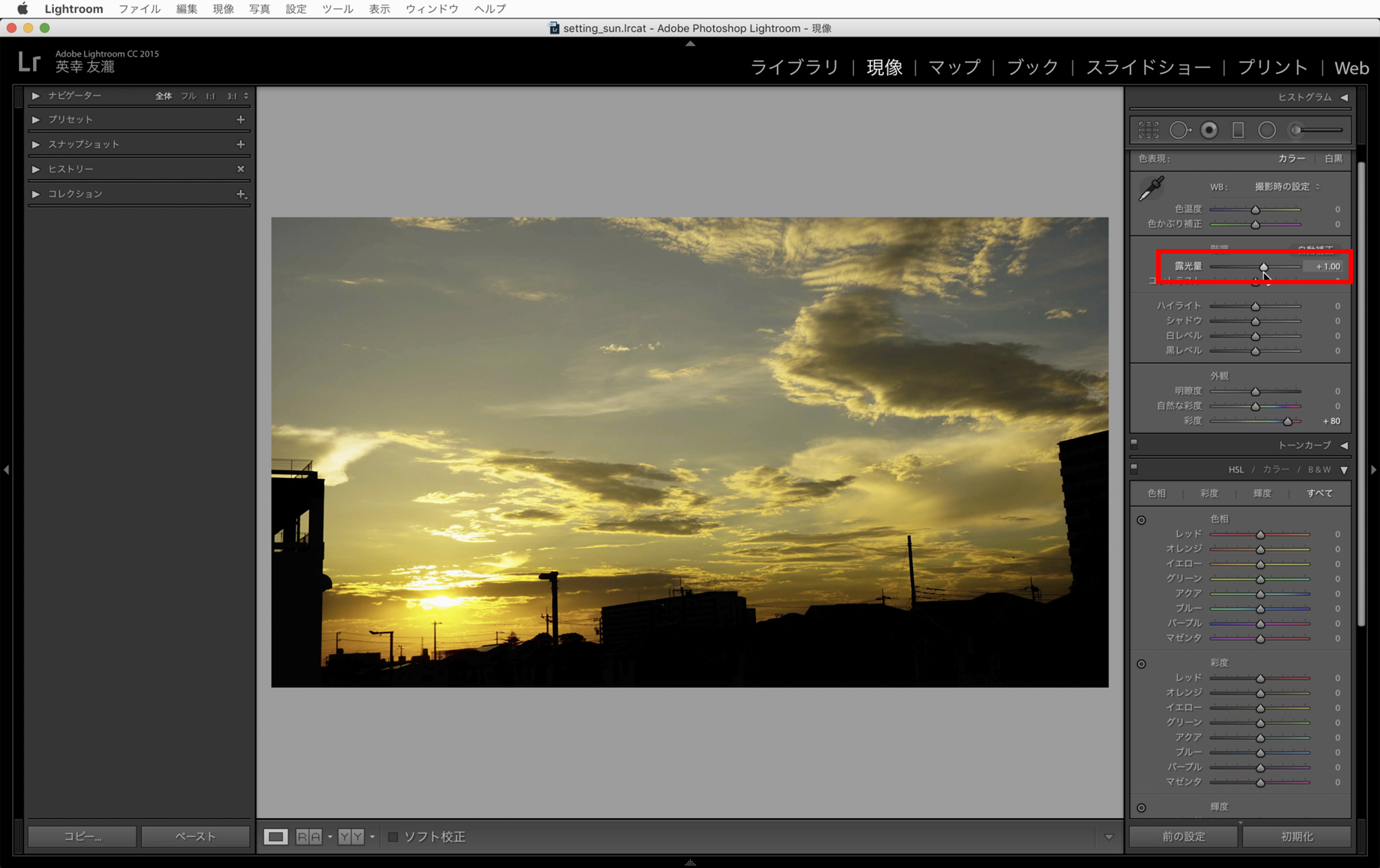 次に、基本補正パネルの[色表現]→[階調]→[露光量]のスライダーを右にドラッグして調整します。
