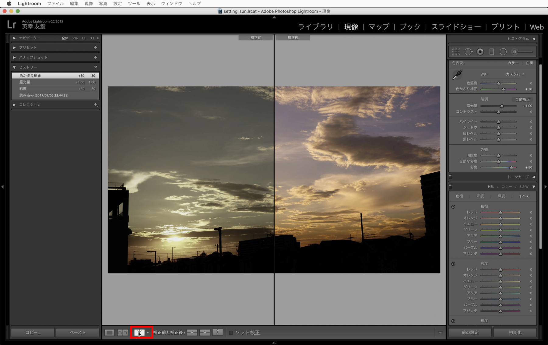 編集画面左下にある[補正前と補正後のビューを切り替え]で補正をかける前とかけた後の画像を並べて表示できます。画像の大きさを変えずに補正前と後の表示を確認したい場合は、ショートカットの[¥]を押します。