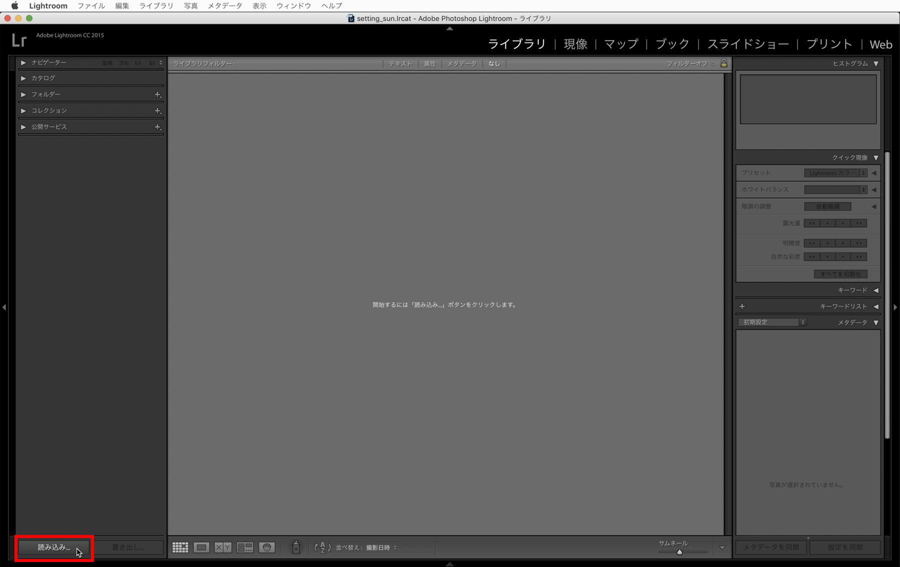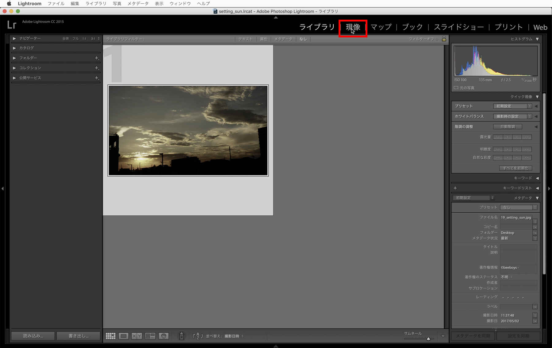 写真が読み込み終わったら編集したい写真をクリックして選択し、[現像]タブをクリックするか、ショートカットの[D]を押します。現像のモジュールに切り替わり、画像編集に入ります
