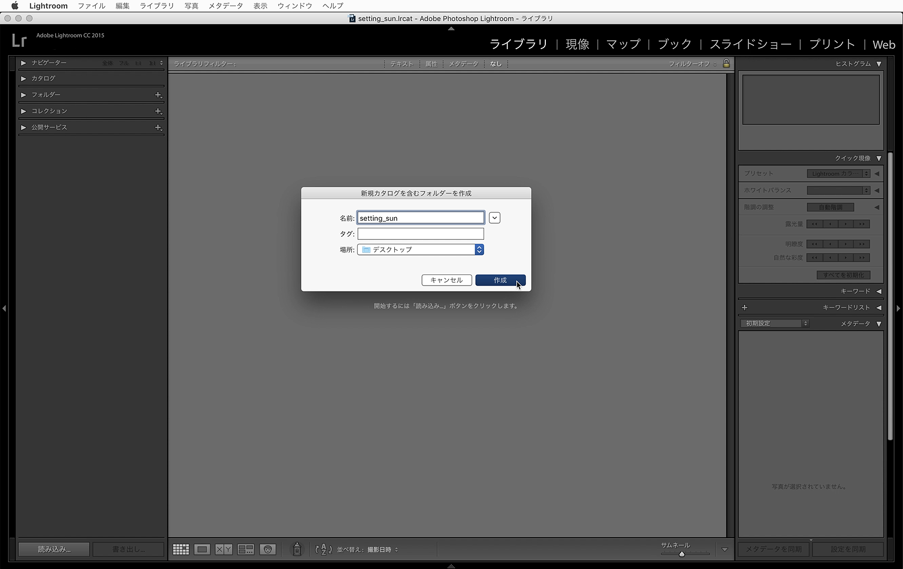 アプリケーションメニューの[ファイル] → [新規カタログ]をクリックします。「新規カタログを含むフォルダーを作成」ダイアログボックスが表示されるので、好きな名前をつけて[作成]ボタンをクリックします。フォルダーが作成され、Lightroom CCが再起動して、作成したカタログを開きます。テーマごとにカタログを作ると管理がしやすくなります。