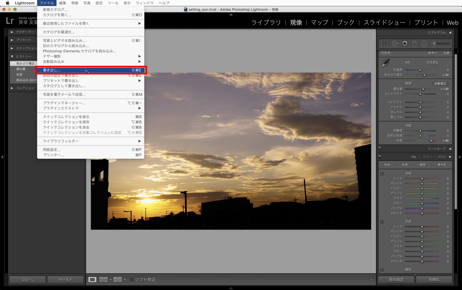 調整ができたら書き出します。[ファイル]メニュー → [書き出し]をクリックして書き出しメニューを表示します。