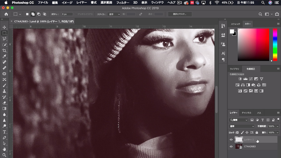 「他のツールで編集」「Adobe Photoshopで編集」と進めてPhotoshopで画像を開き、新しいレイヤーを作成してさらに微調整します。これにより、元のファイルは変更されないため、いつでも元に戻せます。