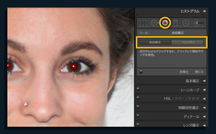 ワークスペースの右側にあるツールストリップで、赤目修正 ツールをクリックします。