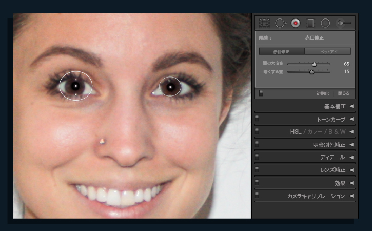 赤目修正パネルのスライダー を使用して、瞳の大きさや暗くする量を微調整します。