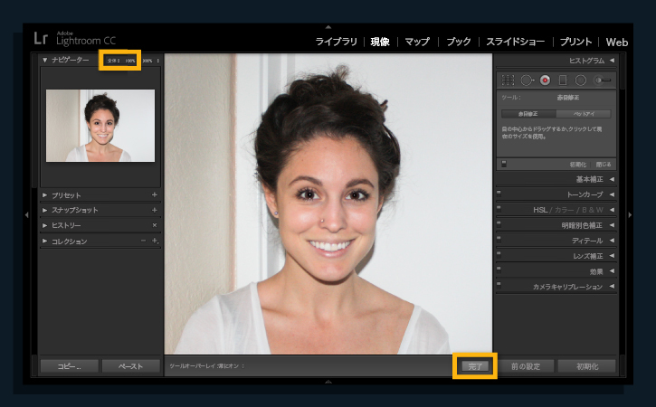 ナビゲーターパネルの「全体 」または「フル 」をクリックして写真全体を表示します。