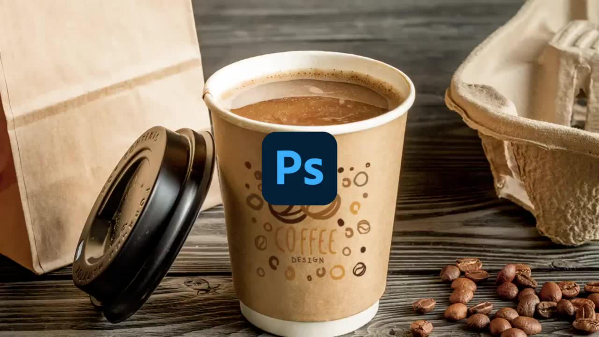 変形の「ワープ」を使ってコーヒーカップの曲面に合わせてロゴの画像を追加し、描画モードの「乗算」で自然に馴染ませる方法を紹介します。