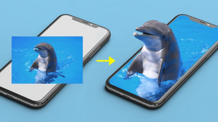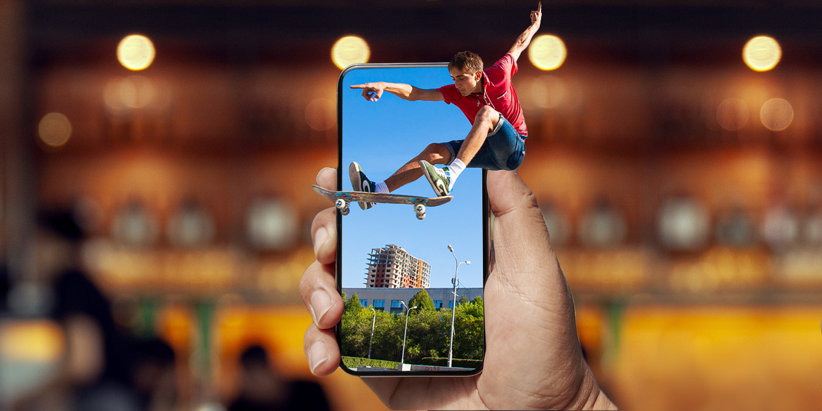 レイヤーとレイヤーマスクを使用して、スマートフォン画面の画像からスケートボーダーがジャンプしてくる 3D ポップアウト効果を作成します。