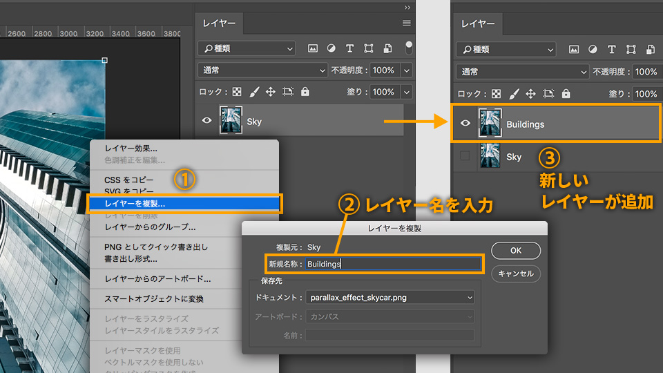 「レイヤーパネル」で「レイヤー0」を選択し、ダブルクリックします。レイヤー名を「Sky」と入力します。この「Sky」レイヤーを選択している状態で、マウスを右クリック(Windows)またはControlキーを押しながらクリック(Mac)し、表示されるメニューから「レイヤーを複製」を選択します。ダイアログが表示されるので、レイヤー名を「Buildings」と入力して「OK」をクリックします。レイヤーパネルに新しいレイヤーが追加されます。