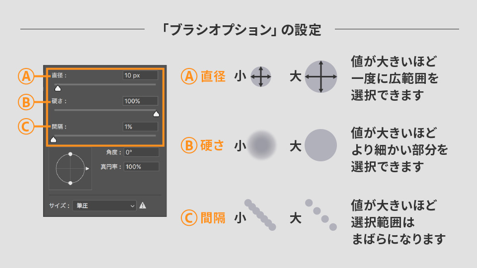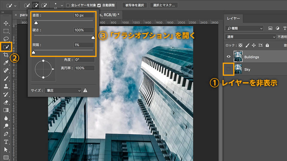 次に「Buildings」レイヤーを選択して、ツールパネルから「クイック選択ツール」を選択します。画面上部のオプションバーから「ブラシオプション」を開き、設定を「直径:10px、硬さ:100%、間隔:1%」にします。