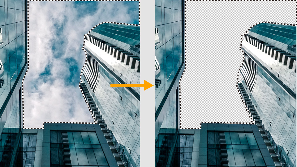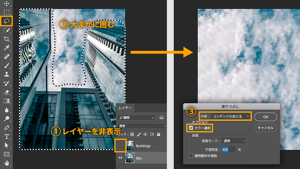 「Sky」レイヤーを選択した状態で、ツールパネルから「なげなわツール」を選択し、ビルを大まかに囲みます。多少、空のエリアが選択されてもかまいません。