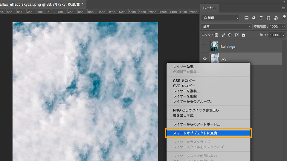 レイヤーパネルの「Sky」レイヤーを選択した状態で、マウスを右クリック(Windows)またはControlキーを押しながらクリック(Mac)し、メニューから「スマートオブジェクトに変換」をクリックします。続けて「Buildings」レイヤーの目のアイコンをクリックし、レイヤーを表示して同様にスマートオブジェクトに変換します。