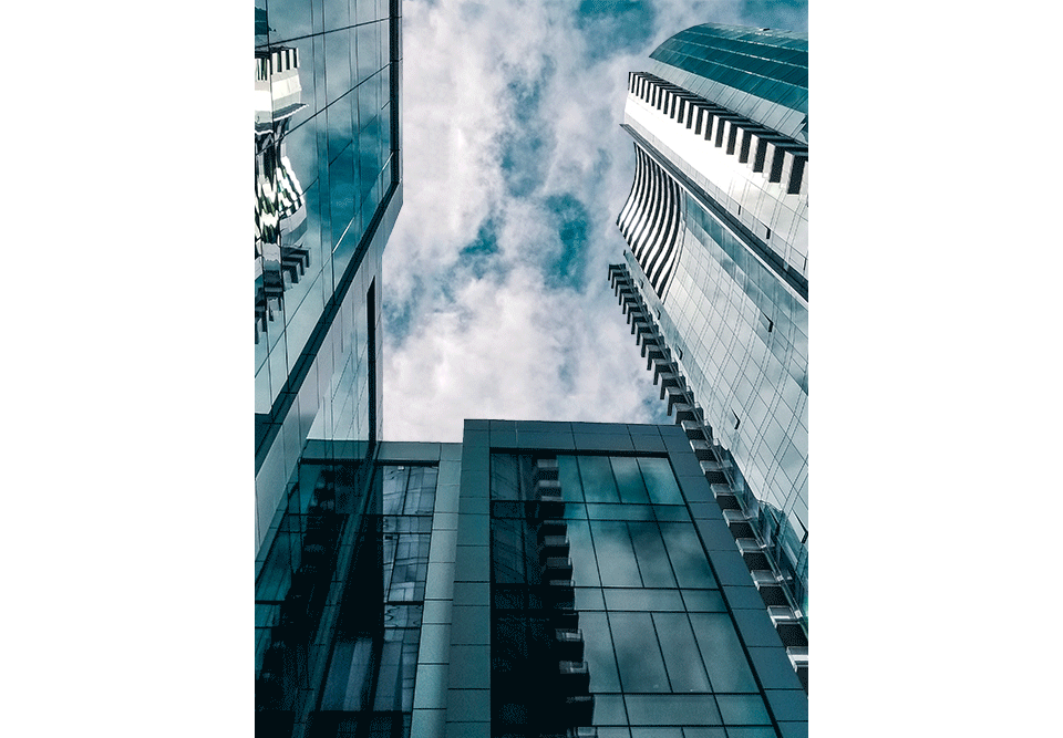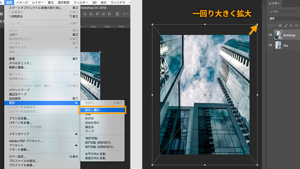 次に「Buildings」レイヤーを選択した状態で、「編集」→「変形」→「拡大・縮小」をクリックします。画像の周囲にバウンディングボックスが表示されるので、「Alt」+「Shift」キー(Windows)または「Option」+「Shift」キー(Mac)を押しながらハンドルを外側にドラッグし、ビルの画像を一回り大きく拡大します。「Enter」キーを押して変形を確定します。