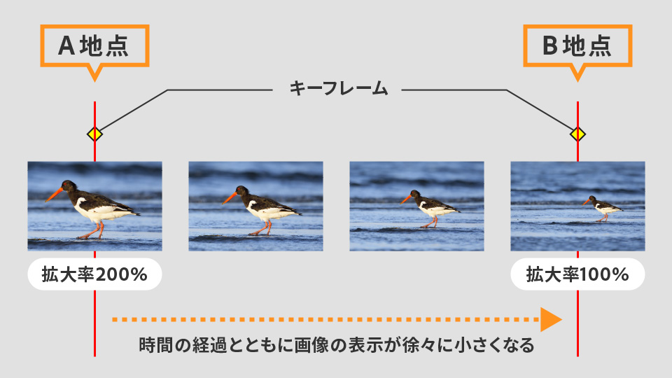ここからは、アニメーションを作成していきます。作業に入る前に、キーフレームによるアニメーションのしくみについて説明します。アニメーションは、静止画像が連続して何枚もつながった状態でできており、その1枚1枚をフレームと言います。キーフレームは、アニメーションの起点と終点になるもので、特定のフレームに対して大きさや位置、不透明度などを指定します。例えばA地点のフレームにキーフレームを設定し、画像を拡大します。B地点のフレームには別のキーフレームを設定し、画像を縮小します。すると、A地点からB地点までのフレーム間で、画像の大きさが徐々に変化するアニメーションが自動的に生成されます。