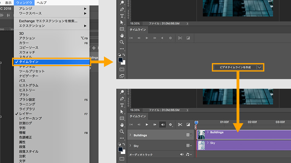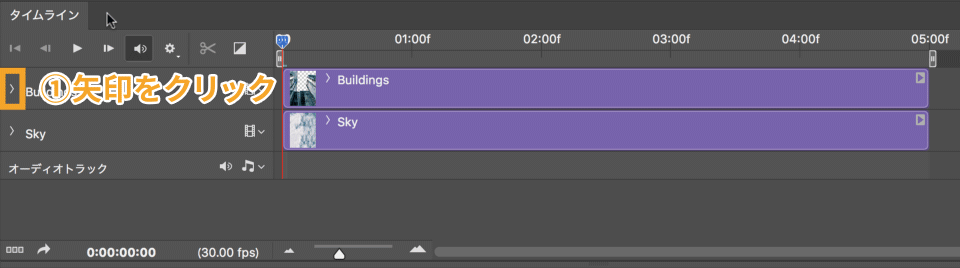 「ウィンドウ」→「タイムライン」をクリックし、「タイムライン」パネルを表示します。次に、「タイムライン」パネルの中央に表示されている「ビデオタイムラインを作成」をクリックします。タイムラインに「Sky」と「Buildings」の2つのレイヤー(ビデオレイヤー)が表示されます。