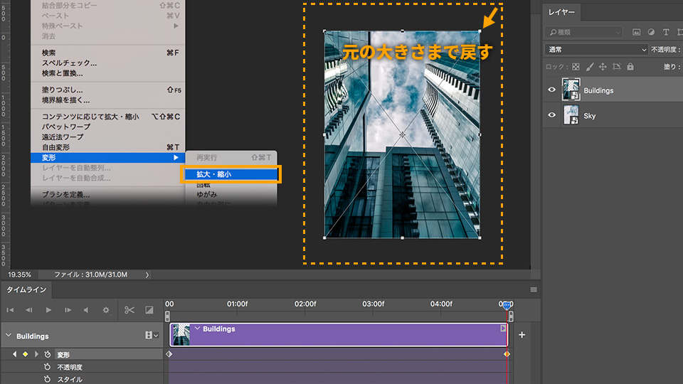 続いて、「Buildings」レイヤーを選択した状態で、「編集」→「変形」→「拡大・縮小」をクリックします。「Alt」+「Shift」キー(Windows)または「Option」+「Shift」キー(Mac)を押しながら、バウンディングボックスのハンドルを内側にドラッグし、ビルの画像を元の大きさまで戻します。「Enter」キーを押して変形を確定します。