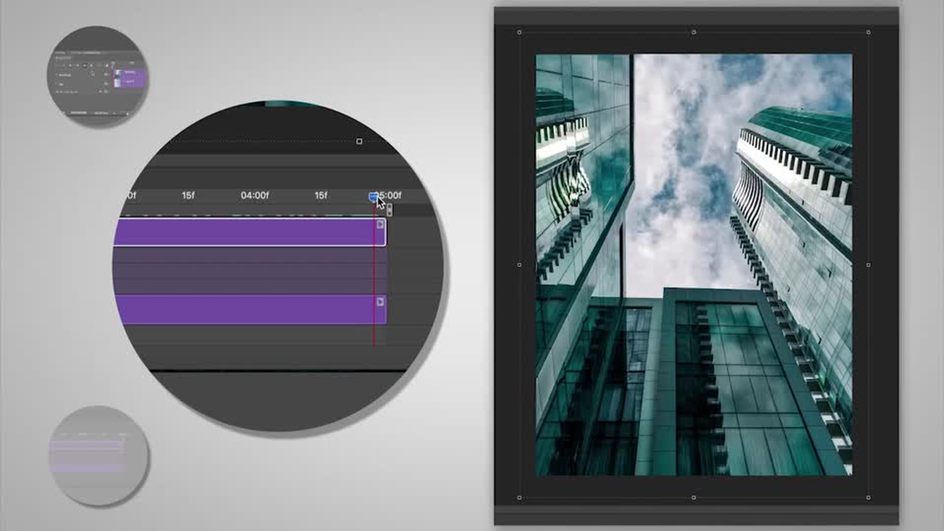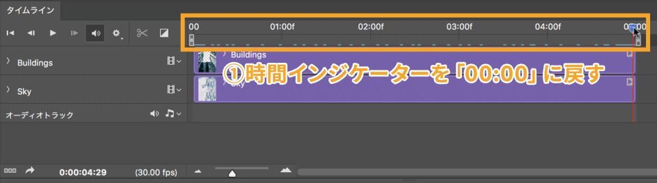 ここからは、「タイムライン」パネルを使用してそれぞれのレイヤーにアニメーションを設定していきます。まずは、ビルが徐々に縮小表示されていくアニメーションを作成してみます。