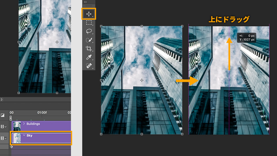 続いて、「Sky」レイヤーを選択した状態で、「移動」ツールを使って画像を上にドラッグして移動させます。