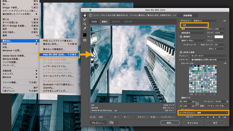 完成したアニメーションをWebで表示させるために書き出してみましょう。「ファイル」→「書き出し」→「Web用に保存(従来)」をクリックします。「Web用に保存」ウインドウが表示されたら、ファイル形式を「GIF」に設定し、サイズや画質、アニメーションのループ回数などを指定して、「保存」をクリックします。