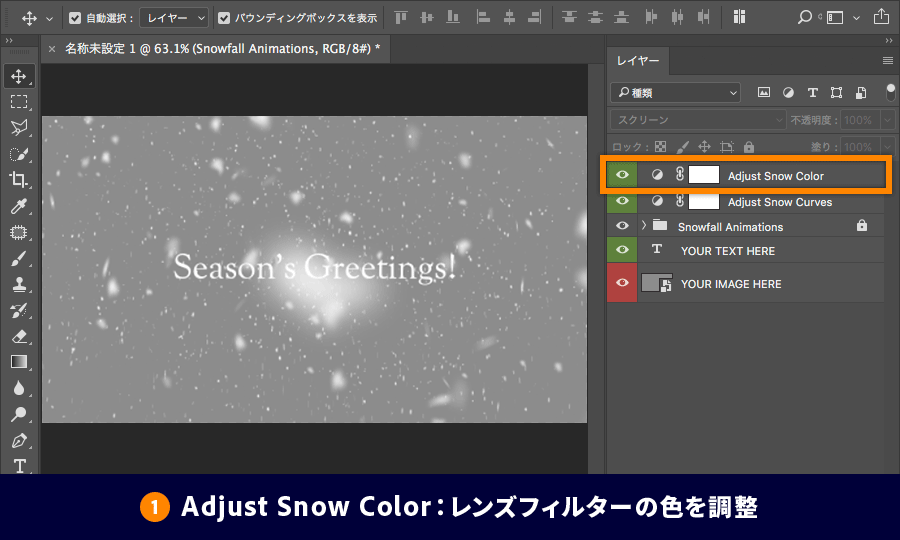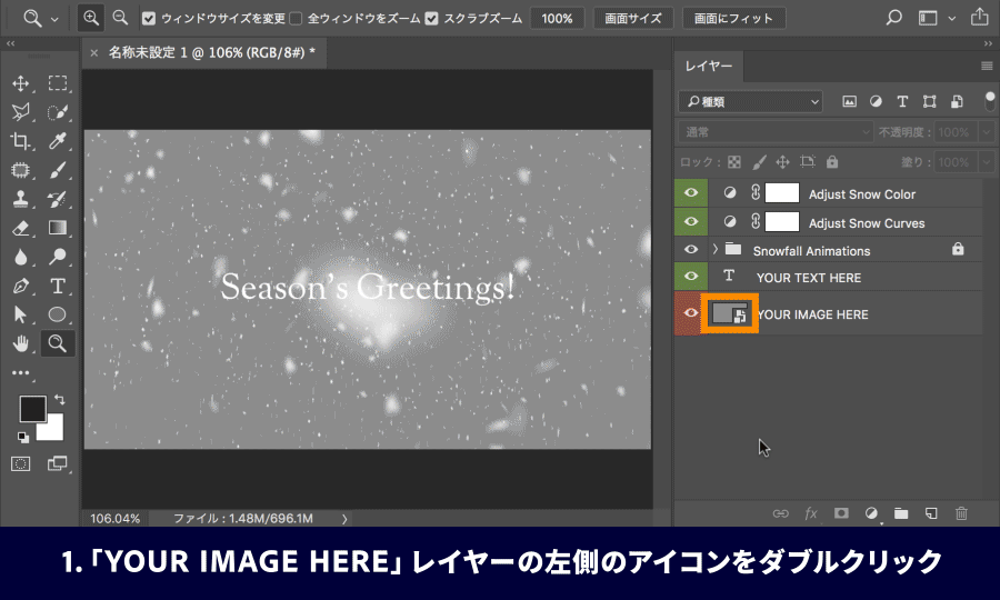 次はテキストです。「レイヤー」パネルの「YOUR TEXT HERE」レイヤーを選択します。左の「ツール」パネルから「横書き文字ツール」を選択するか、キーボードの「T」を押します。「Season’s Greeting!」と入力されたテキストを選択し、好きなワードを入力して打ち替えます。