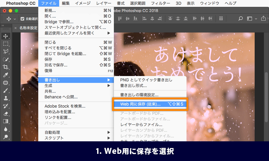 これで一通り作業は完了しました。動くデジタル年賀状ということで、どのように画像が動くのか、さっそく書き出してみましょう。「ファイル」→「書き出し」→「Web用に保存(従来)」をクリックして、ダイアログボックスを開きます。書き出し形式は「GIF」に、画面下の「ループオプション」は「無限」を指定します。「保存」をクリックし、名前と保存場所を指定して再度「保存」をクリックします。
