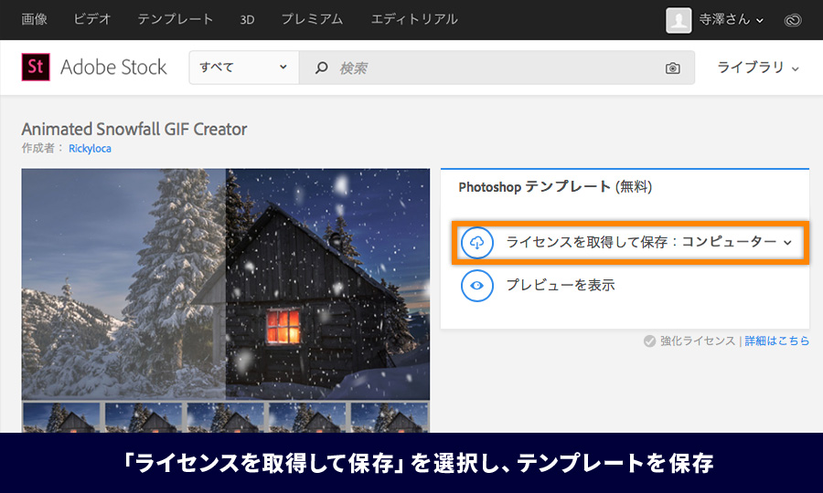 サムネールの右にある「ライセンスを取得して保存」をクリックすると、素材のダウンロードが始まり、コンピューターに保存されます。(画像は、指定したCreative Cloudライブラリに保存することもできます。また、Photoshopで直接ファイルを開くことも可能です。)